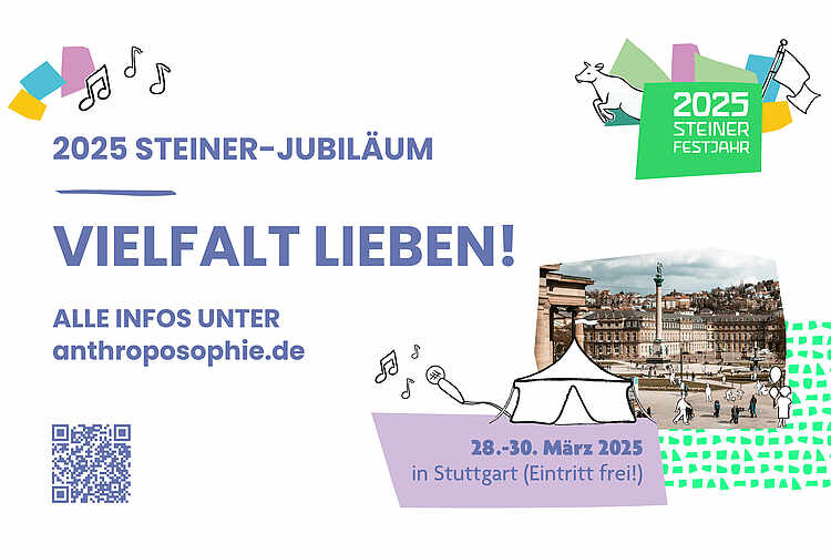 Besuchen Sie uns vom 28. bis 30. März 2025 auf dem Schlossplatz in Stuttgart. Wir laden Sie anlässlich des 100. Todesjahrs von Rudolf Steiner herzlich ein, Steiner und die Anthroposophie neu zu entdecken. Wir haben für Sie einen Marktplatz mit spannenden Themen aufgebaut und ein großartiges Kulturprogramm auf die Beine gestellt. Mit dieser Veranstaltung möchten wir zeigen, wie aktuell Steiners Ideen auch heute noch sind. Freuen Sie sich auf inspirierende Themen zu nachhaltiger Landwirtschaft, ganzheitlicher Bildung und gesunder Lebensweise. Auch Steiners Philosophie und ein kritischer Blick auf sein Werk stehen im Fokus. Unser Motto für die drei Festtage lautet „Vielfalt lieben“ und ist sowohl Anspruch als auch Zielsetzung.