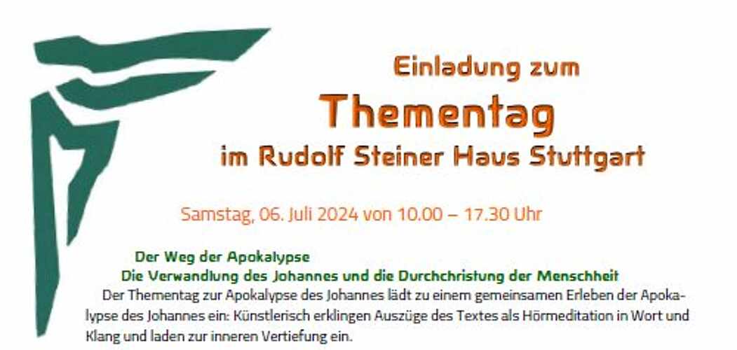 Der Thementag zur Apokalypse des Johannes lädt zu einem gemeinsamen Erleben der Apoka-lypse des Johannes ein: Künstlerisch erklingen Auszüge des Textes als Hörmeditation in Wort und Klang und laden zur inneren Vertiefung ein.