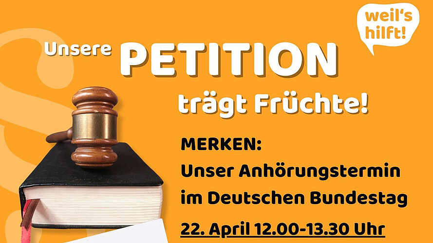 Vor diesem Hintergrund hat der Petitionsausschuss des Deutschen Bundestages entschieden, dass die öffentliche Anhörung zu unserer Petition am 22. April 2024 vorerst NICHT stattfinden wird. Das können wir als einen Teilerfolg verbuchen!