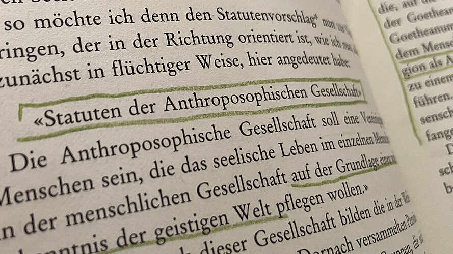 Statuten von Steiner | Foto: S.Knust Während der Generalversammlung 2019 und der Beratungen zu einer stärkeren Partizipation der Mitglieder stellte Gerald Häfner die Initiative zur Aufarbeitung der Konstitutionsfrage der Allgemeinen Anthroposophischen Gesellschaft vor. Initianten waren Justus Wittich (Vorstand am Goetheanum), Michael Schmock (Generalsekretär der Anthroposophischen Gesellschaft in Deutschland) und Gerald Häfner (Goetheanum-Leitung und Leiter der Sozialwissenschaftlichen Sektion) als Prozessgruppe. Die Initiative wollte prozessorientiert sein und interessierte Mitglieder zu Kolloquien einladen.